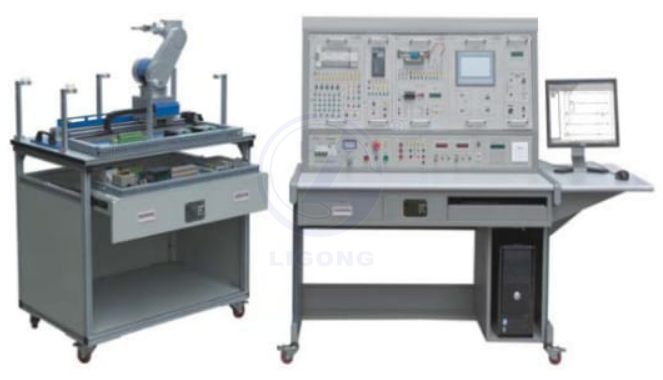 實(shí)訓(xùn)裝置由控制屏、實(shí)訓(xùn)桌、PLC模塊、通信模塊、變頻器模塊、模擬實(shí)訓(xùn)模塊、觸摸屏模塊、五自由度機(jī)械手、交流電機(jī)、電機(jī)導(dǎo)軌、測(cè)速機(jī)構(gòu)、加載系統(tǒng)、MCGS工控組態(tài)軟件(配加密狗)等組成。