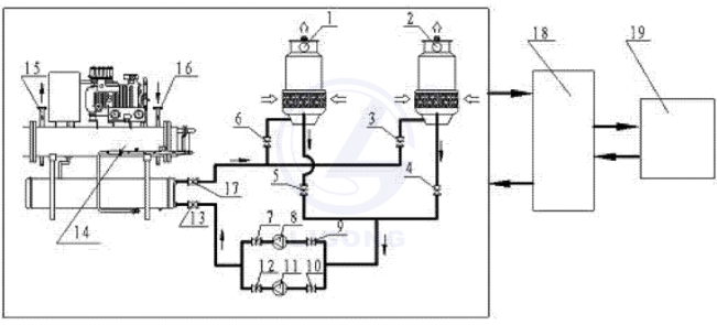 附圖1中:1為第一冷卻塔、2為第二冷卻塔、3為第二冷卻塔進水調節(jié)閥、4為第二冷卻塔出水調節(jié)閥、5為第一冷卻塔出水調節(jié)閥、6為第一冷卻塔進水調節(jié)閥、7為第一水泵出口調節(jié)閥、8為第一水泵、9為第一水泵進口調節(jié)閥、10為第二水泵進口調節(jié)閥、11為第二水泵、12為第二水泵出口調節(jié)閥、13為冷凝器進水調節(jié)閥、14為冷水機組、15為蒸發(fā)器出口、16為蒸發(fā)器進口、17為冷凝器出水調節(jié)閥、18為PLC控制系統(tǒng)、19為計算機系統(tǒng)。