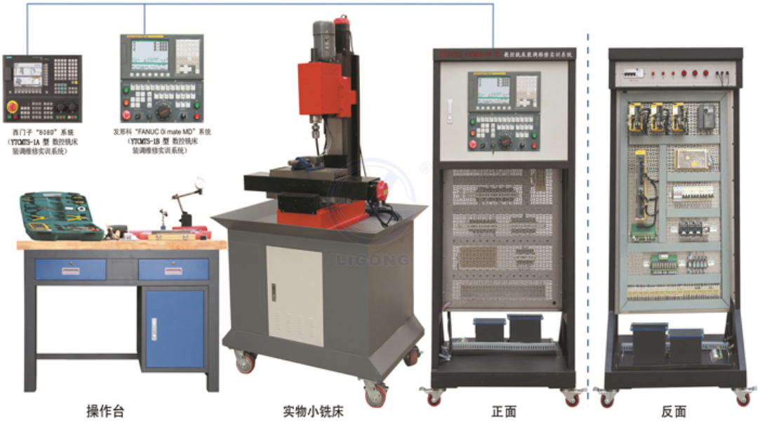 1.  數(shù)控銑床維修實訓(xùn)系統(tǒng)(西門子) (配實物小銑床)由機床實訓(xùn)柜、實物小銑床和操作臺等組成。