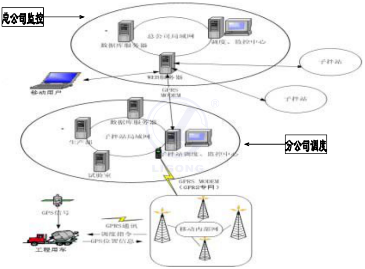 根據(jù)以上三大原則為宗旨, "GPS混凝土生產(chǎn)調(diào)度系統(tǒng)”應(yīng)用了GPRS為基礎(chǔ)通信傳輸方式,為了補(bǔ)充現(xiàn)行GPRS公網(wǎng)、ADSL通道高峰、擁堵可能出現(xiàn)的掉線現(xiàn)象,建議與網(wǎng)絡(luò)公司合作采用GPRS專網(wǎng)技術(shù),使其為公司提供高效的遠(yuǎn)程互聯(lián),各子攪拌站只需利用GPRS MODEM即可接入GPRS專網(wǎng),使之兼?zhèn)淞斯娋W(wǎng)的便捷和專用網(wǎng)的安全,同時(shí)實(shí)現(xiàn)貼切的應(yīng)用,快捷的通信,安全的數(shù)據(jù),經(jīng)濟(jì)的投資。