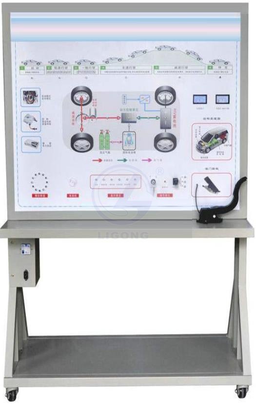 3、示教板面板上安裝有點(diǎn)火開關(guān)、工況開關(guān)、油門踏板、擋位開關(guān)、制動開關(guān)、轉(zhuǎn)速表、電流指示表等,并輔以發(fā)光二極管進(jìn)行系統(tǒng)流向的動態(tài)指示,還設(shè)有一臺模擬電機(jī)用來演示電動機(jī)的工作狀態(tài)。
