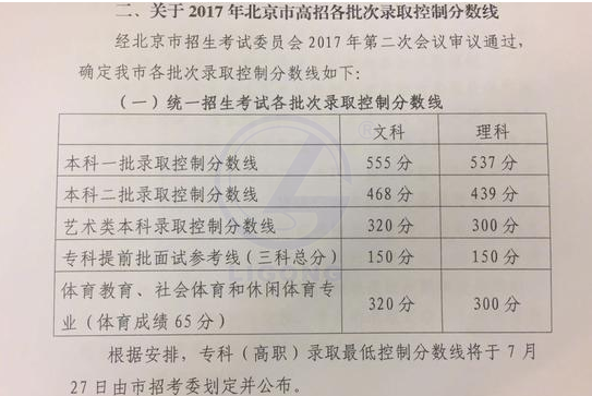 2017年北京高考分?jǐn)?shù)線出爐:一本理科539分文科555分