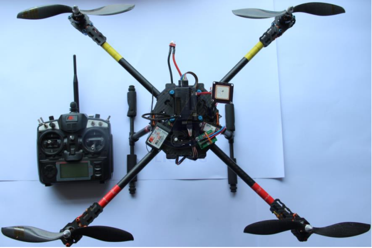 系統(tǒng)采用四軸飛行器作為航空運(yùn)輸?shù)妮d體,它主要由碳纖維四軸機(jī)架、ArduPilotMega 飛行姿態(tài)控制器、GPS定位模塊、915M無(wú)線數(shù)據(jù)傳輸模塊、電壓電流傳感器、鋰電池電壓測(cè)量模塊、2.4G 無(wú)線控制器、2.4G 無(wú)線接收器、三相直流無(wú)刷電機(jī)、三相直流無(wú)刷電機(jī)調(diào)速器、碳纖維1045正反槳、11.1V 3S鋰電池組、電池組平衡充電器等組成,提供全面的四軸飛行器開(kāi)發(fā)資料。