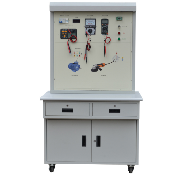 (1)實訓臺主體部分采用全鋼結構,鋼板亞光噴塑,美觀耐用,臺面采用鋁塑板印制而成,整個實訓臺由漏電保護開關、熔斷器、開關電源、數(shù)顯計時器、智能刷卡啟動電路板、數(shù)字兆歐表、交流接觸器、指針萬用表、數(shù)字萬用表、照明日光燈、帶鎖開關、按鈕開關、電動機、磨光機和安全接線柱等組成。