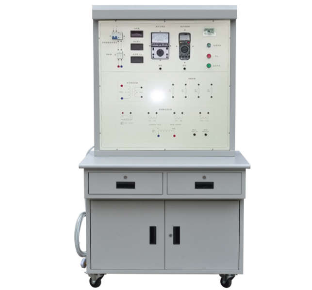 (1)實(shí)訓(xùn)臺(tái)主體部分采用全鋼結(jié)構(gòu),鋼板亞光噴塑,美觀耐用,臺(tái)面采用鋁塑板印制而成,整個(gè)實(shí)訓(xùn)臺(tái)由漏電保護(hù)開(kāi)關(guān)、熔斷器、開(kāi)關(guān)電源、數(shù)顯計(jì)時(shí)器、智能刷卡啟動(dòng)電路板、單繞組變壓器、多繞組變壓器、交流接觸器、數(shù)字電壓表、數(shù)字電流表、指針萬(wàn)用表、數(shù)字萬(wàn)用表、照明日光燈、帶鎖開(kāi)關(guān)、按鈕開(kāi)關(guān)、負(fù)載電阻和安全接線柱等組成。