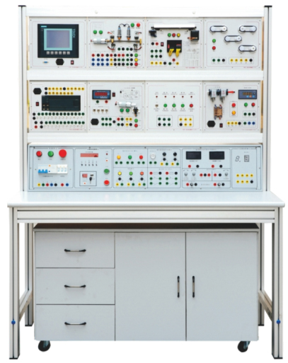 該裝置采用鋁木結(jié)構(gòu)實(shí)訓(xùn)臺(tái),實(shí)訓(xùn)臺(tái)架由實(shí)訓(xùn)屏(含電源控制屏)、實(shí)訓(xùn)桌、實(shí)訓(xùn)儲(chǔ)物柜三大部分組成。實(shí)訓(xùn)屏包括電源指示和控制單元、時(shí)間管理器(含電源保護(hù))單元、指示燈和按鈕單元、選擇開(kāi)關(guān)和蜂鳴器及繼電器單元、儀表單元、直流電源單元,電源控制屏的左右兩側(cè)分別裝有一個(gè)兩插插座,將外部電源進(jìn)線端裝在電源控制屏的左側(cè)(采用航空插連接結(jié)構(gòu));實(shí)訓(xùn)屏上部采用三根不銹鋼型材組成通用實(shí)訓(xùn)模塊固定結(jié)構(gòu),一次可擺放8個(gè)實(shí)訓(xùn)模塊,模塊采用標(biāo)準(zhǔn)化結(jié)構(gòu)、互換性強(qiáng),根據(jù)實(shí)訓(xùn)內(nèi)容的需要調(diào)換實(shí)訓(xùn)模塊;存儲(chǔ)柜用于存放工具材料及模塊。