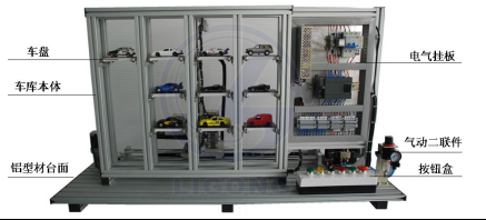 本立體倉(cāng)庫(kù)實(shí)訓(xùn)系統(tǒng)可以完成車輛的手動(dòng)和自動(dòng)迫車、車位信息狀態(tài)顯示。它主要包括以下幾個(gè)部分:鋁型材臺(tái)面、倉(cāng)庫(kù)本體、車盤、電氣掛板、氣動(dòng)二聯(lián)件、按鈕盒和二維運(yùn)動(dòng)機(jī)構(gòu)等。如圖3-1和圖3-2所示: