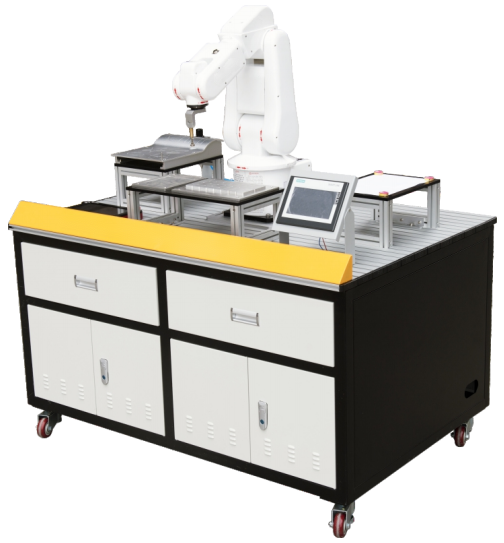 隨著現(xiàn)代制造業(yè)和服務業(yè)的轉型升級,工業(yè)機器人在測量檢驗、包裝、分揀處理、搬運、碼垛、填裝、機器上下料、裝配、金屬切割、焊接、噴涂等領域得到了越來越多的應用。在不同領域的應用會對機器人的安裝、編程、調試人員提出了不同的要求。根據(jù)這一工作的需要設計了LGY-JC02B型工業(yè)機器人基礎實訓設備。該設備是由一臺六軸工業(yè)機器人、書寫工作站、曲面軌跡工作站、碼垛工作站、實訓桌、電氣控制部分組成。設備全部采用工業(yè)標準電氣設備進行安裝生產且為當今自動化主流設備,該設備能完成由現(xiàn)實工業(yè)生產轉變?yōu)榭晒W生學習的高仿真度的現(xiàn)場工作環(huán)境,培養(yǎng)學生的認知能力及學習能力,使學生一進入該領域即可快速適應現(xiàn)實中的生產物流環(huán)節(jié),提高學生的競爭力。