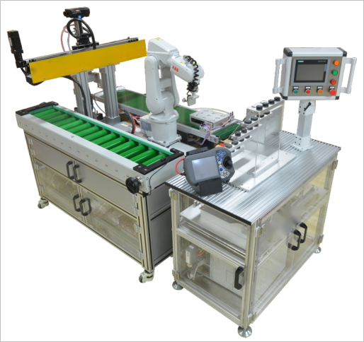 該設(shè)備主要由ABB120工業(yè)機(jī)器人、混合式流水線(皮帶式、滾筒式)、物料轉(zhuǎn)換臺(tái)、直角坐標(biāo)上下料機(jī)械臂、機(jī)器人底座、機(jī)器人配套工裝夾具、電氣控制柜以及配套的各種實(shí)訓(xùn)模塊單元等組成。
