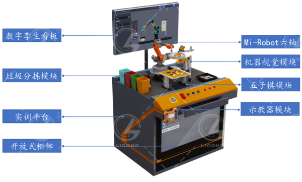 該系統(tǒng)包含了機器視覺控制系統(tǒng)、機器視覺仿真系統(tǒng)、六軸機器人、工控機系統(tǒng)以及3D數(shù)字孿生系統(tǒng),該平臺采用模塊化方式組成,并配套數(shù)字化看板和實訓(xùn)臺,形成對機器人的高級集成和綜合應(yīng)用的實訓(xùn)仿真平臺。