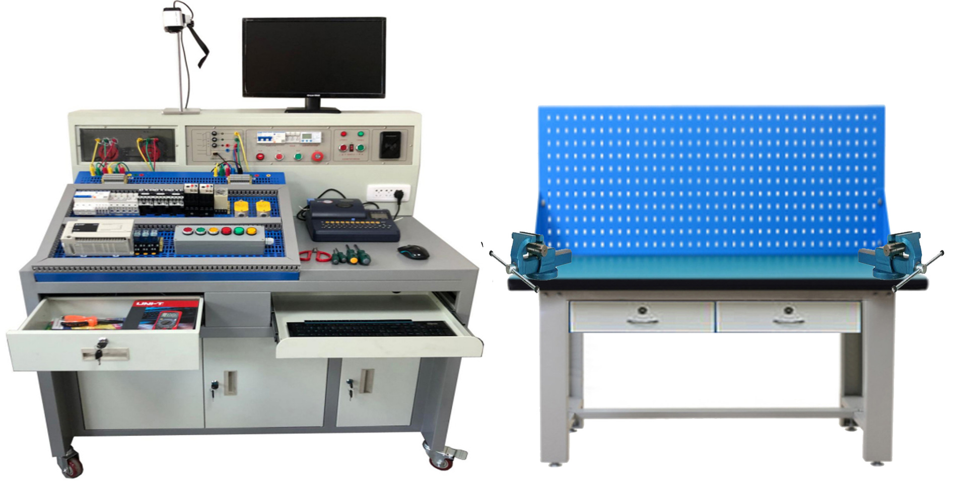 (1)本設(shè)備由實訓(xùn)屏(內(nèi)置電源)、實訓(xùn)桌、儲物柜三大部分組成。以30mm×30mm成型方鋼作為設(shè)備主要框架材料;實訓(xùn)屏、地盤采用焊接連接、關(guān)鍵部位采用三角筋用內(nèi)六角螺釘加固連接,表面經(jīng)高溫噴塑處理,美觀大方且有效起到防銹絕緣的作用;由兩條35mm×35mm鋁合金型材及滑槽組成網(wǎng)孔板固定機(jī)構(gòu);固定機(jī)構(gòu)的下方是鐵制雙工位電源箱,每工位電源箱的布局依次為電源保護(hù)裝置、電源指示裝置、電源輸出;實訓(xùn)桌桌面采用雙層亞光密紋結(jié)構(gòu),表面經(jīng)過噴塑處理,提高防銹、絕緣性能;實驗桌底部裝有至少4個導(dǎo)向輪,方便設(shè)備移動。