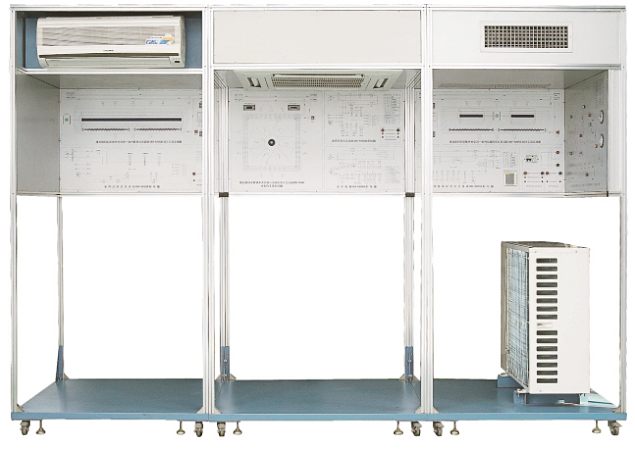1.裝置底盤采用加強(qiáng)鈑金結(jié)構(gòu)設(shè)計(jì),框架采用鋁型材結(jié)合鋁塑板封面組成。有室外機(jī)模塊、天井式室內(nèi)機(jī)模塊、掛壁式室內(nèi)機(jī)模塊、風(fēng)機(jī)盤室內(nèi)機(jī)模塊四套模塊組成一個(gè)完整的家用中央空調(diào)系統(tǒng)。
