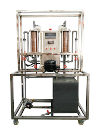采用透明耐壓玻璃作殼體的壓縮機、盤管蒸發(fā)器、盤管冷凝器。循環(huán)水泵,玻璃轉(zhuǎn)子流量計,調(diào)節(jié)閥門組、PVC板冷卻水箱;測試系統(tǒng)由8路萬能信號輸入液晶顯示巡檢儀、PT100熱電偶組成;有工作臺架可隨時移動。