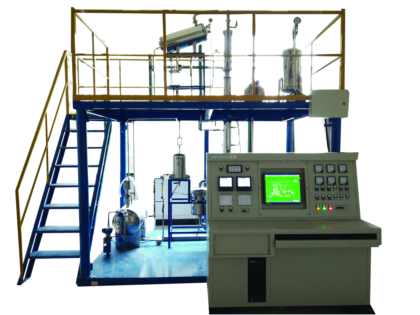 過程控制精餾操作實訓裝置主體:3700x2000x3500mm(長x寬x高),(可根據(jù)實訓場地實際高度和場地面積進行調(diào)整),整機采用鋼制噴塑框架,帶兩層操作平臺,一層平面方便安裝、檢修,二層有安全斜梯通上并有護欄、防滑板。