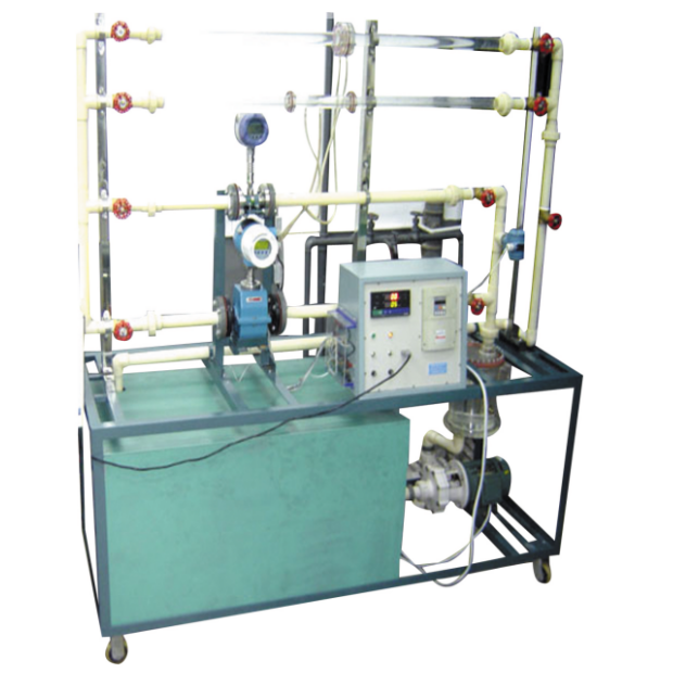 循環(huán)水箱,計量水箱、水泵,有機(jī)玻璃穩(wěn)壓罐、管路、有機(jī)玻璃測試管段、渦輪流量計、孔板流量計、文丘里流量計、渦街流量計、差壓傳感器、變頻器、鉑電阻溫度傳感器,巡檢儀、不銹鋼支架及控制柜。