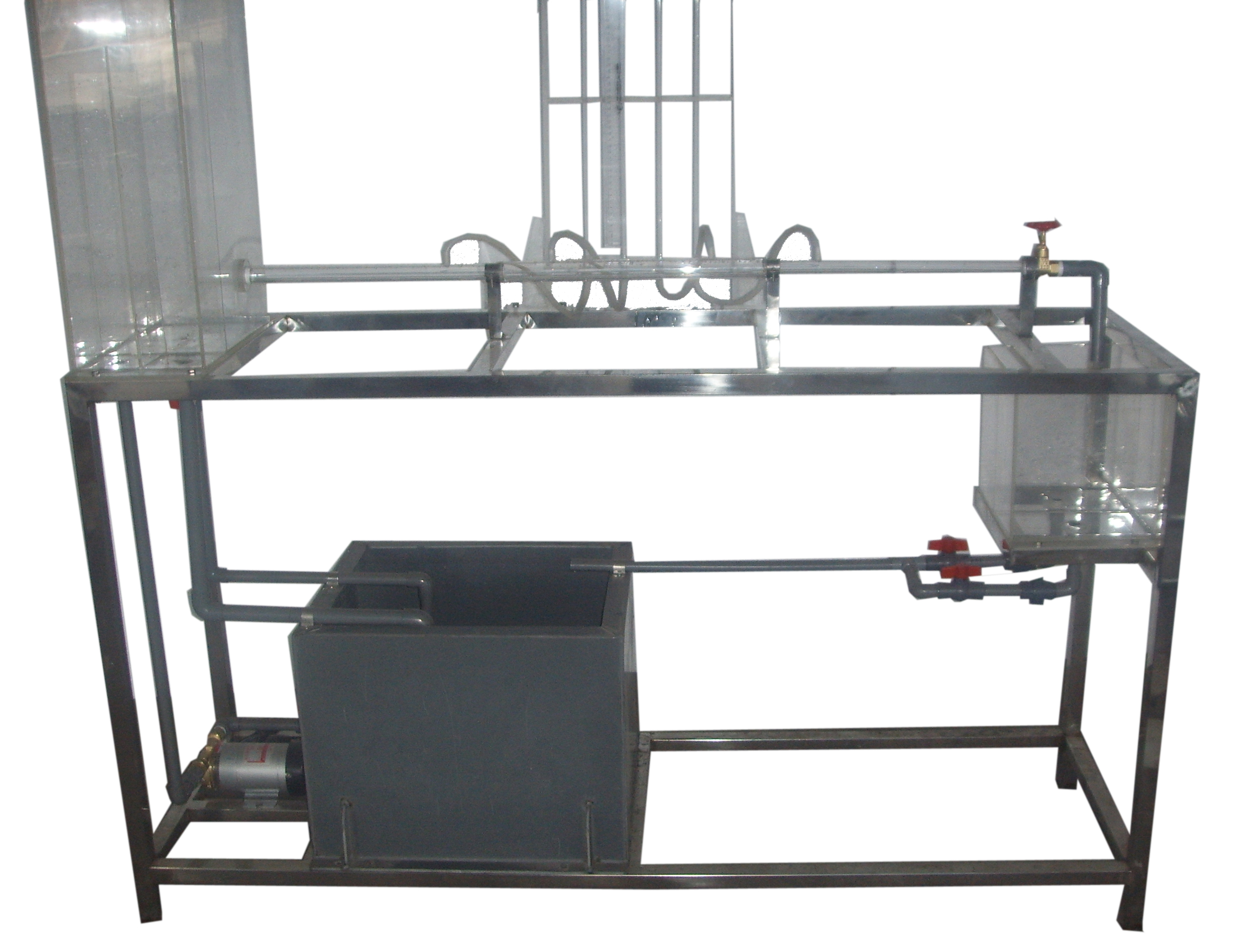 有機玻璃實驗水箱、局部阻力管、測壓管、水泵、蓄水箱、計量水箱、刻度標尺、秒表、玻璃溫度計、自循環(huán)裝置、閥門、不銹鋼框架。